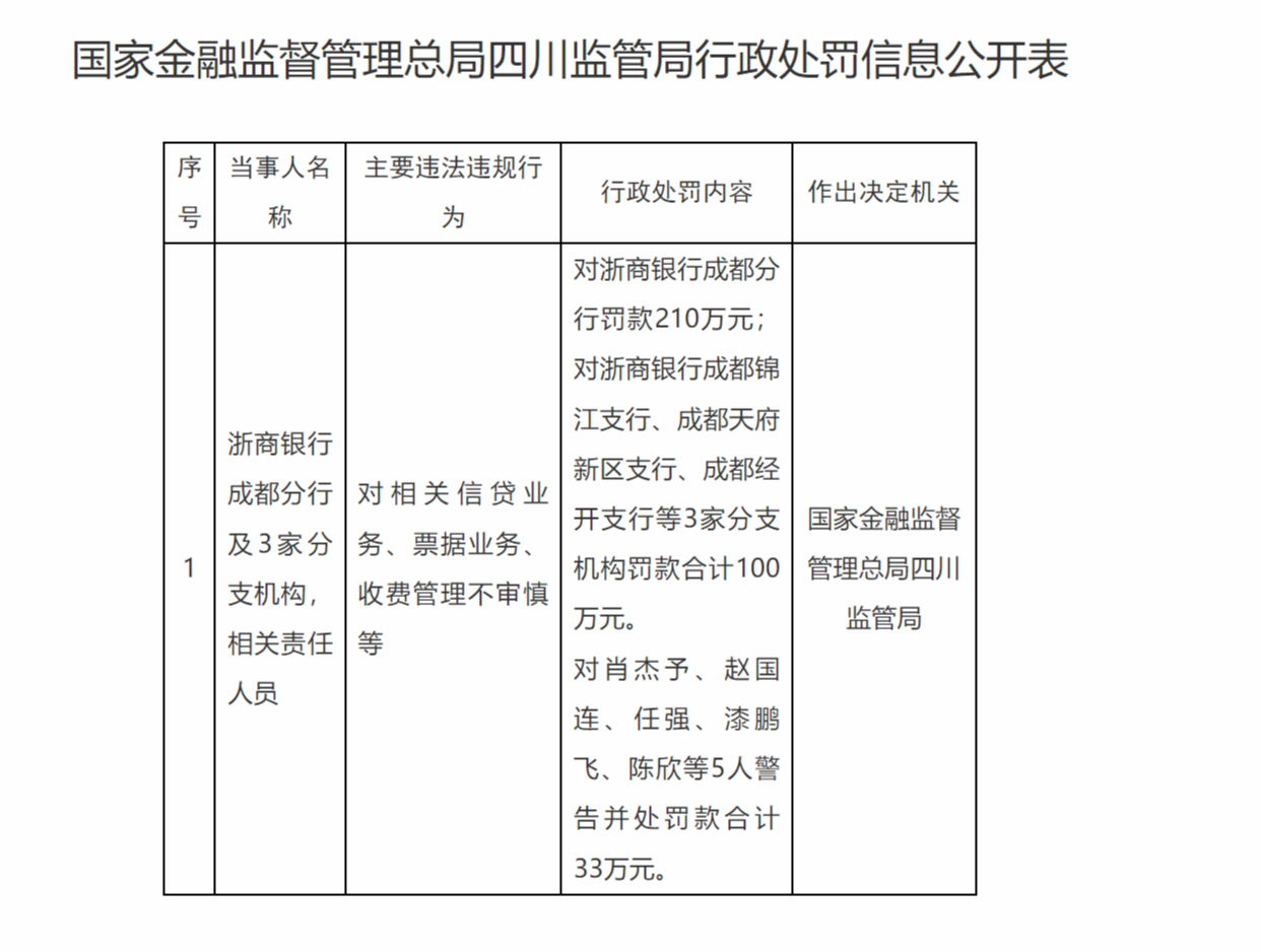 浙商银行成都分行被罚款210万元;浙商银行成都锦江支行、成都天府新区支行、成都经开支行等3家分支机构被罚款合计100万元。