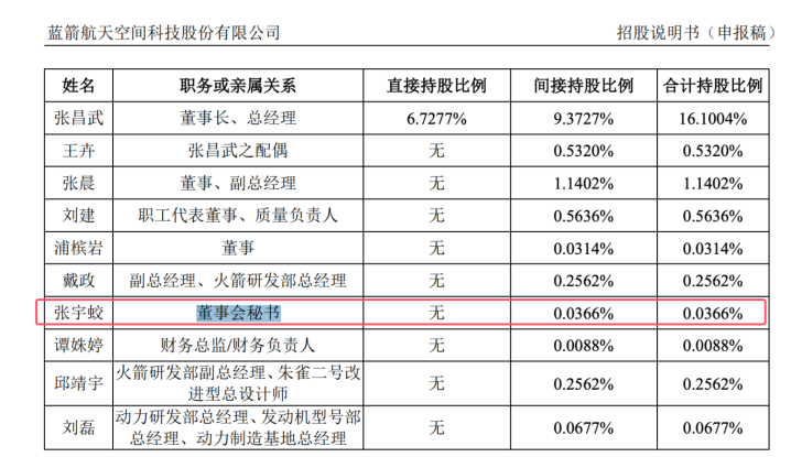 5、张宇蛟先生,现任蓝箭航天董事会秘书,1984年生,中国国籍,无境外永久居留权,硕士研究生学历。2011年9月至2019年4月于北京市金杜律师事务所任职;2019年4月至今历任蓝箭航天资本市场部总经理、法务部总经理、董事会秘书。有0.036%股份。