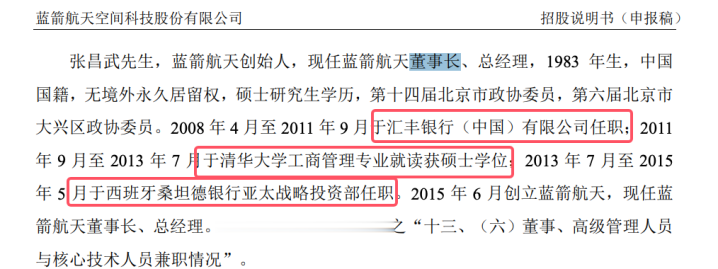 3、公司董事会等组成很有意思。董事长张昌武,1983年生,中国国籍,无境外永久居留权,硕士研究生学历,第十四届北京市政协委员,第六届北京市大兴区政协委员。2008年4月至2011年9月于汇丰银行(中国)有限公司任职;2011年9月至2013年7月于清华大学工商管理专业就读获硕士学位;2013年7月至2015年5月于西班牙桑坦德银行亚太战略投资部任职。2015年6月创立蓝箭航天,现任蓝箭航天董事长、总经理。